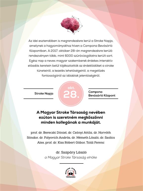 2017. október 28-án a Stroke napon UH vizsgálatot végző kollégák: Dr. Debreczeni Róbert – Semmelweis Egyetem, Neurológiai Klinika Dr. Ilniczky Sándor – Semmelweis Egyetem, Neurológiai Klinika Dr. Magyar Mária Tünde Dr. Orosz Péter – Semmelweis Egyetem, Neurológiai Klinika Dr. Stang Rita – Semmelweis Egyetem, Neurológiai Klinika Dr. Vastagh Ildikó – Semmelweis Egyetem, Neurológiai Klinika Vasné Tereczi Marianna – Semmelweis Egyetem, Neurológiai Klinika